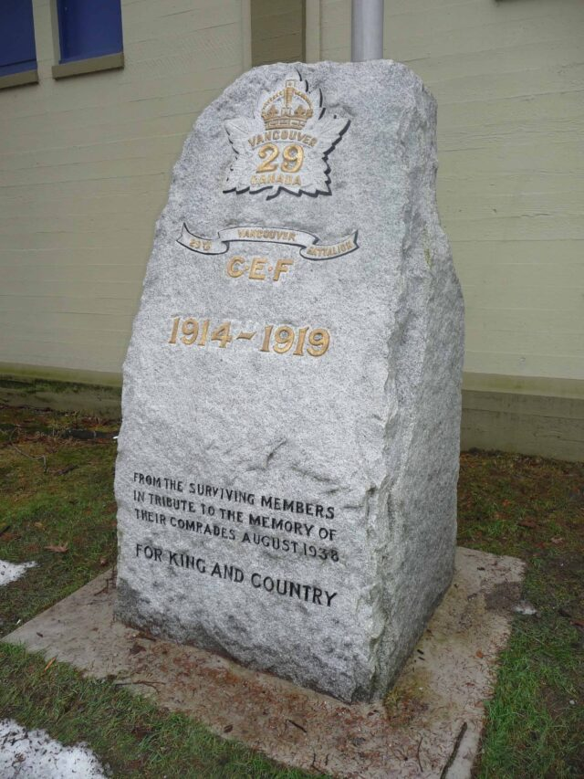 Un mémorial en pierre, situé dans le parc Hastings, a été dédié au Corps expéditionnaire canadien en août 1938, plus précisément au 29e bataillon, par « les membres survivants en hommage à la mémoire de leurs camarades ». Le parc Hastings était un terrain d’entraînement essentiel pour les soldats de novembre 1914 à mai 1915 avant leur départ pour la guerre. Le bataillon, connu sous le nom de « Tobin’s Tigers », a vécu dans le parc pendant sa formation avant de se rendre à New Brighton pour embarquer dans un train.