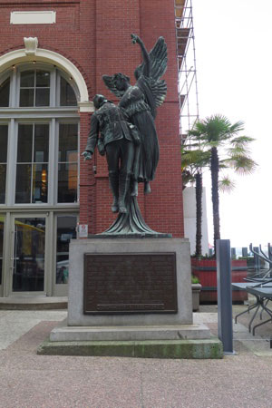 La statue de la Victoire ailée est une sculpture en bronze de l’artiste montréalais Coeur de Lion MacCarthy, installée en 1921. Commandées par le Canadien Pacifique (CP) pour honorer les plus de 1 100 employés de la compagnie morts durant la Première Guerre mondiale, des statues identiques ont été érigées près de sites emblématiques du CP. À Vancouver, le monument se trouve près de la gare Waterfront ; les autres sont à Winnipeg (installée en 1922) et à Montréal (1923). Les dates de la Seconde Guerre mondiale ont été ajoutées plus tard à la base de chaque statue. La « Victoire ailée », aussi appelée « Ange de la Victoire », est considérée comme l’une des sculptures commémoratives les plus poignantes, représentant un ange emportant un soldat tombé au ciel au moment de sa mort.