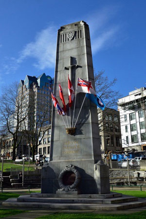 La plus grande cérémonie du jour du Souvenir se tient chaque 11 novembre au cénotaphe de Victory Square. Ce lieu était central pour la jeune ville : il abritait le premier palais de justice de Vancouver, se trouvait au carrefour du quartier de Granville (aujourd’hui Gastown) et de la ville du CP, et servait de point de recrutement pendant la guerre. Le cénotaphe a été conçu par G.L.T. Sharp et inauguré en 1924 devant une foule d’environ 25 000 personnes. Depuis, la cérémonie annuelle du jour du Souvenir s’y déroule. En 2002, des lampadaires en forme de casques de la Première Guerre mondiale ont été installés autour du cénotaphe et sur toute la place.